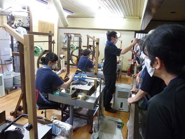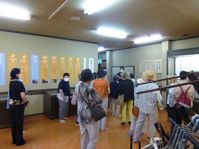 年々夏の気温が高くなり、研修当日も最高気温が35度超えの猛暑日が予想されるため、熱中症予防として研修日直前でしたが急遽午後の研修先をまち散策から屋内見学に変更しました。現地に到着後、まずは牛首紬織りの資料館白山工房へ。古くから養蚕が盛んな白峰の旧地名「牛首」に由来する牛首紬の工房を訪ね、主な生産工程を見学しました。蚕の玉繭から直に挽いた玉糸を用いる等、牛首紬としての定義やその技法、工程はこの地域独特の人から人へと紡ぎ、たくさんの時間と手間をかけたものだと実感しました。糸を触った時の柔らかさが更にそのことを物語っているようでした。その後、2つの資料館を見学しました。