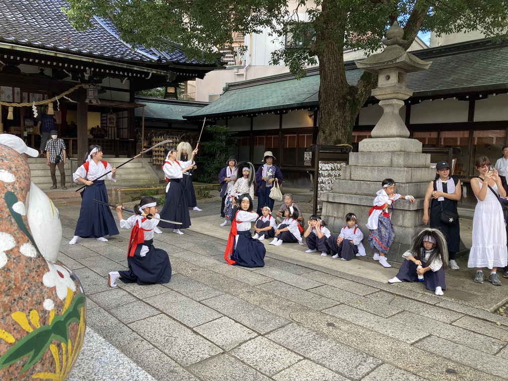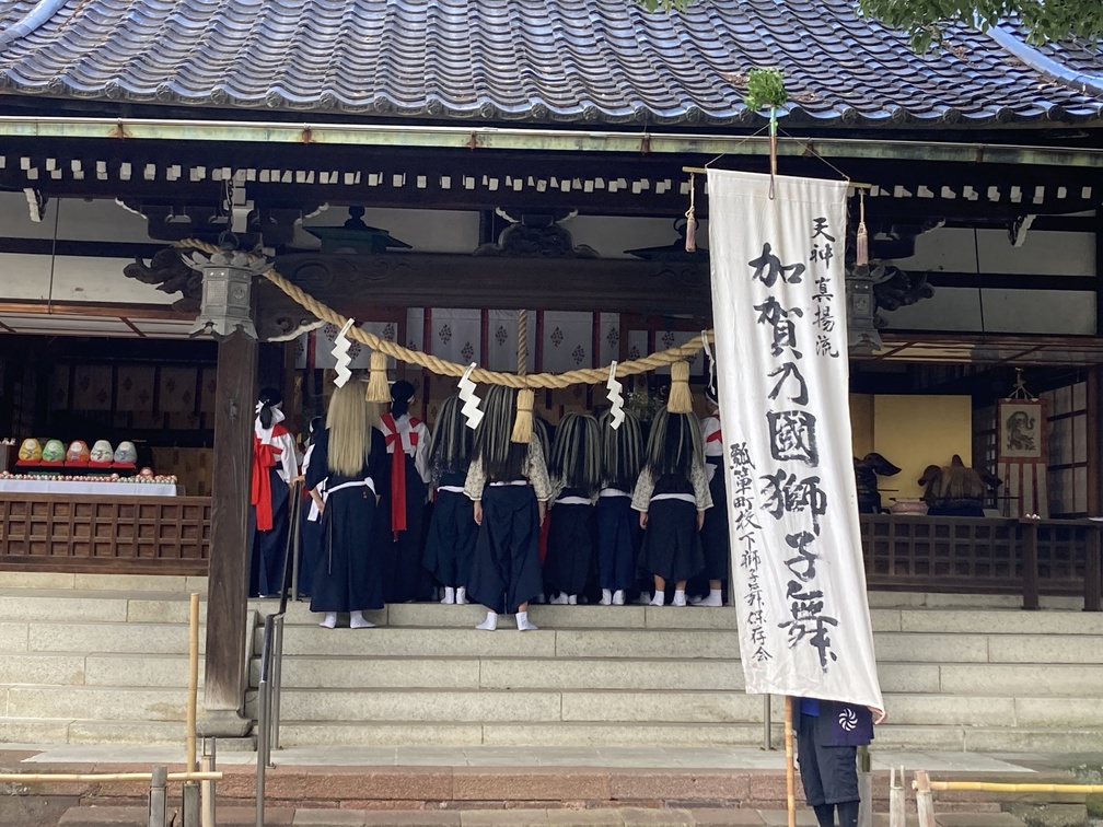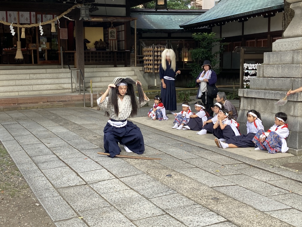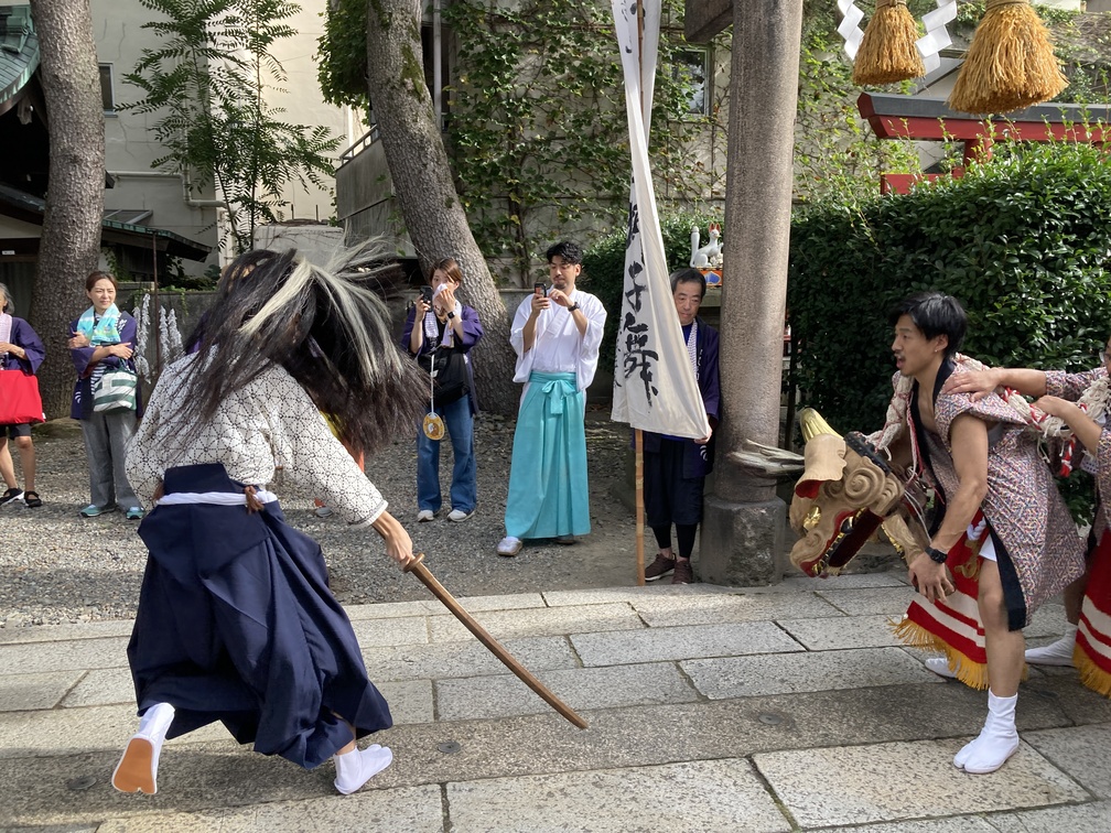 安江八幡宮では、今年初参加の子どもたちが可愛いい初演技を披露し、町廻りでは、三ツ剣は可愛く、女子薙刀は凛々しく、また小太刀や太刀は勇ましく演技を披露し、「よこっちょ・ポッケまーと」でも多くの外国人からも拍手喝さいを浴びました。獅子頭(かしら)振り9人衆も、40周年を記念して新調した麻の葉模様の薄手の袢纏を颯爽と着こなし、猛々しい獅子を演じました。
