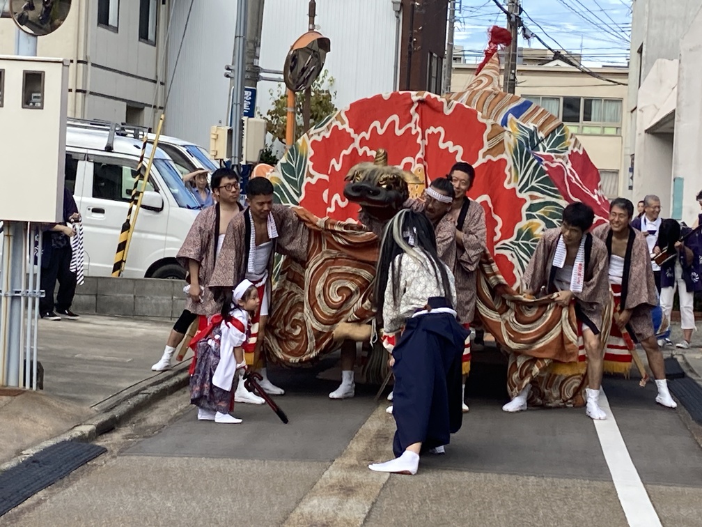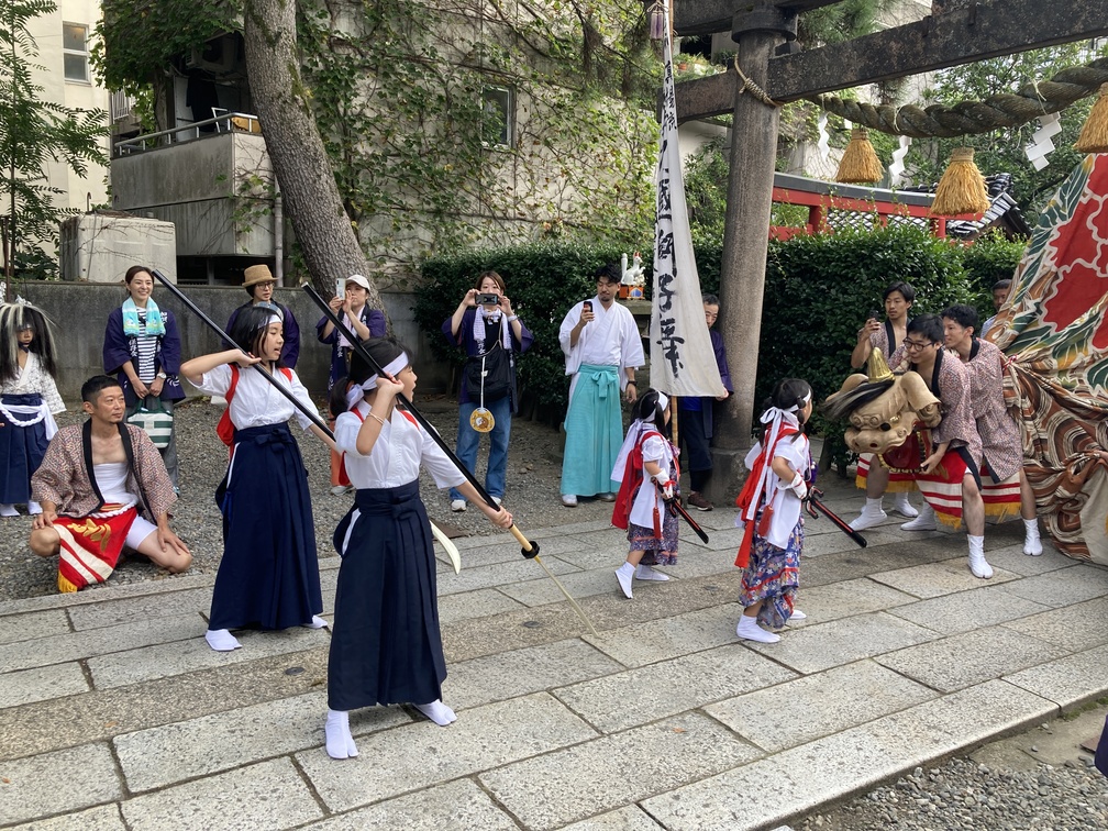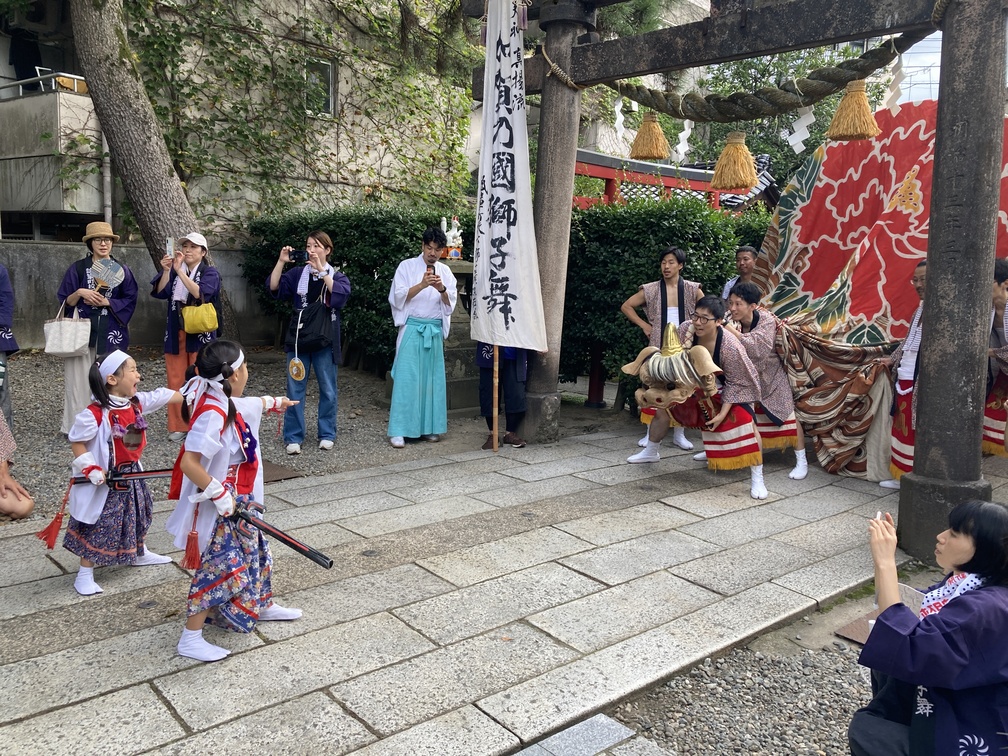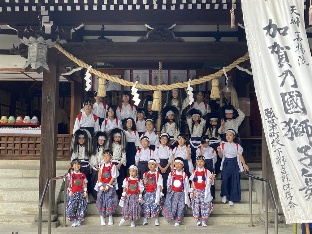 保存会設立40周年を迎えた瓢箪地区秋恒例の獅子舞の町廻りが、安江八幡宮の本祭りの9月15日(日)に、棒振り演技者の幼児から大人まで30名を含む総勢90名の参加により今年も勇壮に行われました。当日は30℃を超える猛暑に加え、スコールにも2回見舞われましたが、皆な最後まで元気な演技を披露してくれました。
