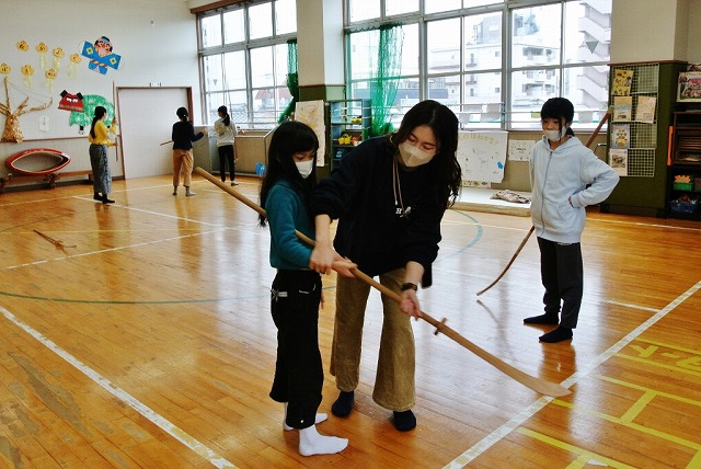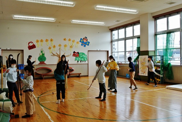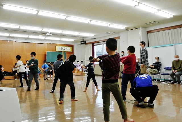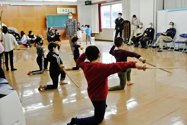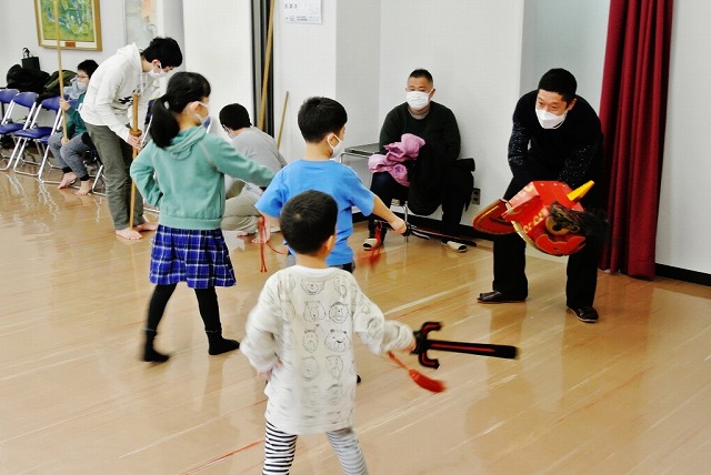新年恒例の瓢箪地区獅子舞保存会による獅子舞初稽古が1月22日(日)に瓢箪町公民館・児童館にて行われました。昨年の秋祭り以来久しぶりの顔合せで、初稽古を待ちかねていたチビッコ剣士たち約30名が顔を揃え、寒さを吹き払うかのように元気に声を張り上げて稽古に取り組みました。約4ヶ月ぶりの演技とあって、「こうだっけ、ああだっけ」と言いながら最初は思い出しながらの自信無げな演技でしたが、最後にはしっかりと声も出て元気よく演技ができました。稽古の後は、3年ぶりにお母さん方が作ってくれた鏡開きのお餅入りのおいしいぜんざいをいただき、新しい年を祝いました。